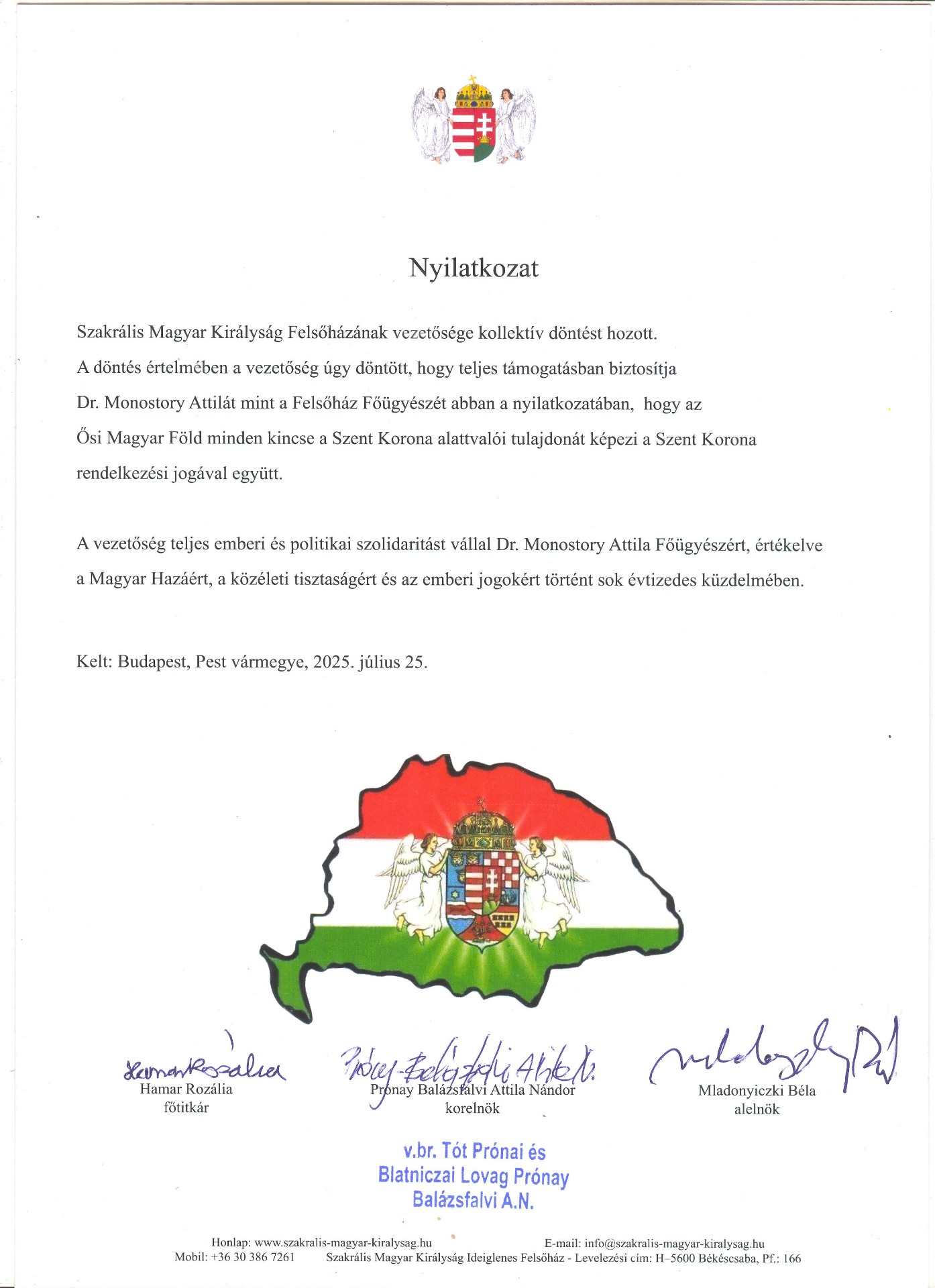 - Szakrális Magyar Királyság Felsőházának vezetősége kollektív döntést hozott. A döntés értelmében a vezetőség úgy döntött, hogy teljes támogatásban biztosítja dr. Monostory Attilát mint a Felsőház Főügyészét abban a nyilatkozatában, hogy az Ősi Magyar Föld minden kincse a Szent Korona tulajdonát képezi a Szent Korona rendelkezési jogával együtt.