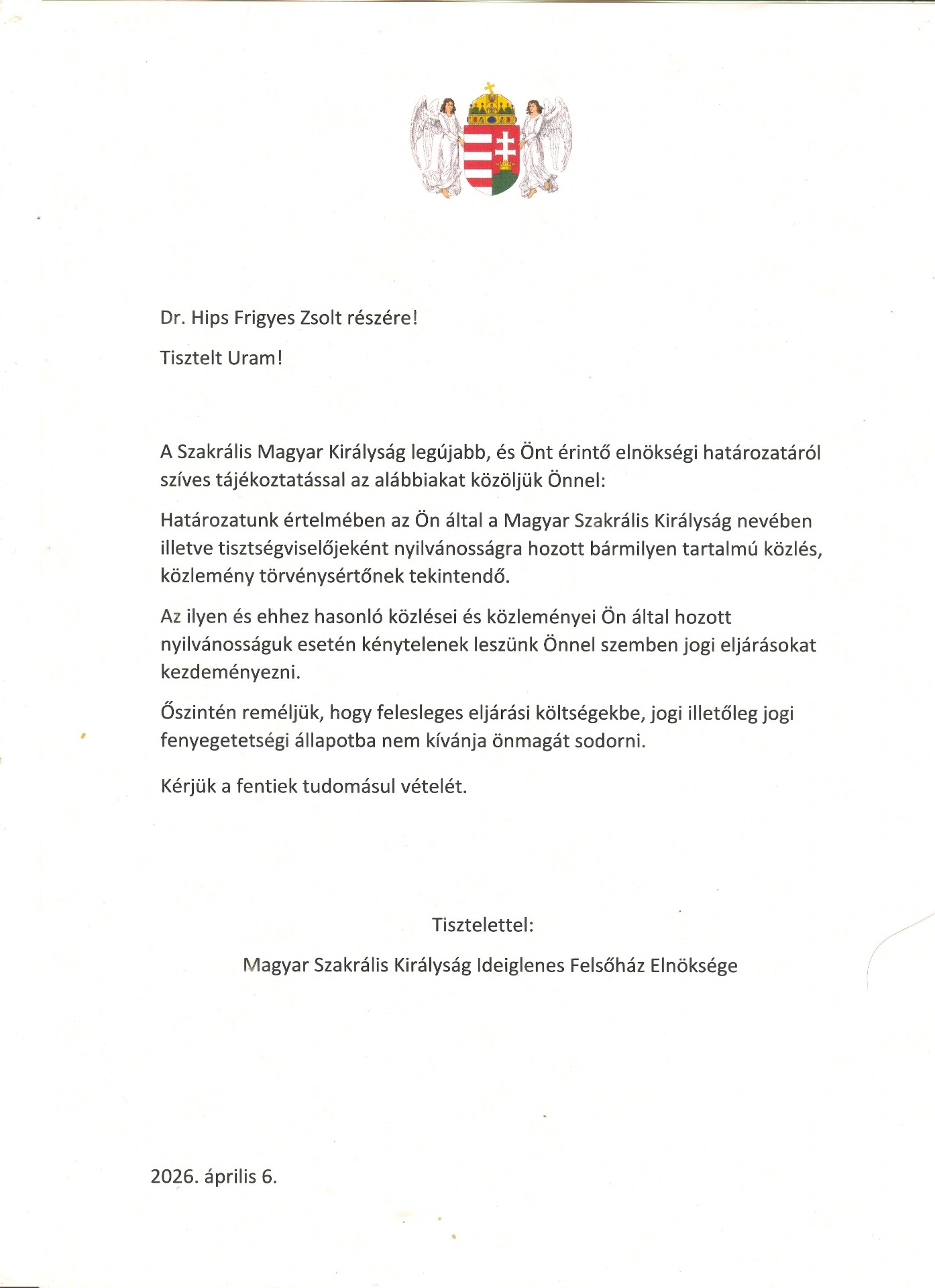 Mi, a Szakrális Magyar Királyság Ideiglenes Felsőházának képviseletében, alulírott Korelnök, a mai napon az alábbi nyilatkozatot tesszük közzé: