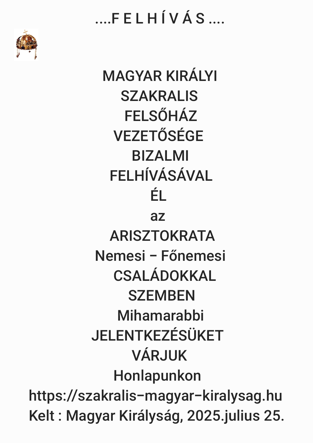 A Szakrális Magyar Királyság Ideiglenes Felsőház - Együtt a Magyar Nemzetért.