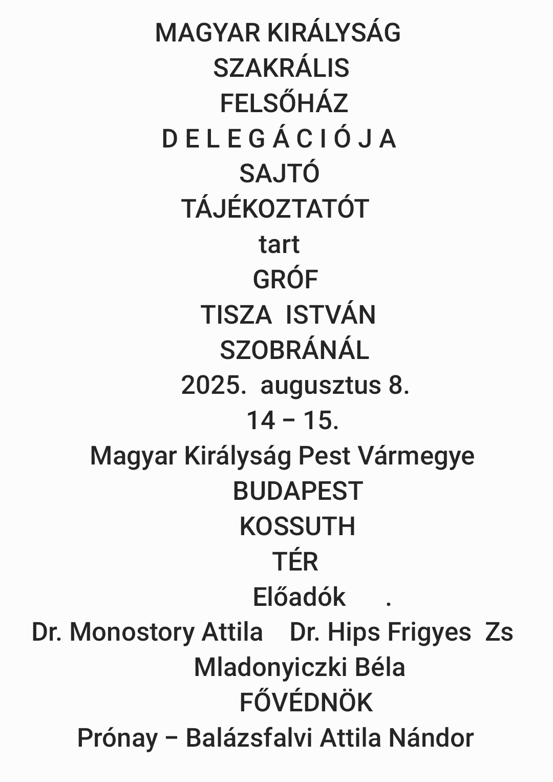 - FELTÁMADÁSUK LÉTRE IS JÖTT 2024./év elejében és konkrétabban Dr. Hips Frigyes Zsolt általiak terén, mikor is előre leegyeztetvén Prónay Balázsfalvi Attila Nándor nevezetű személyével (tanu jelenlétében is mint Hamar Rozália személyére vonatkoztatva) tisztelet teljes meghívást küldött, amin belül Kápolnán számos tanuk jelenlétében Pünkösd Vasárnapján a köztiszteletben tartott felkért személyt Lovag Prónay Balázsfalvi Attila Nándort egyöntetű szavazásuk kapcsán megválasztják korelnöknek a Szakrális Magyar Királyság (Ideglenes) felsőházába. Ez meg is történt ekkor amiről jegyzőkönyv, és hang, valamint rövid videó felvétel, de fotók is készültek ekkor.